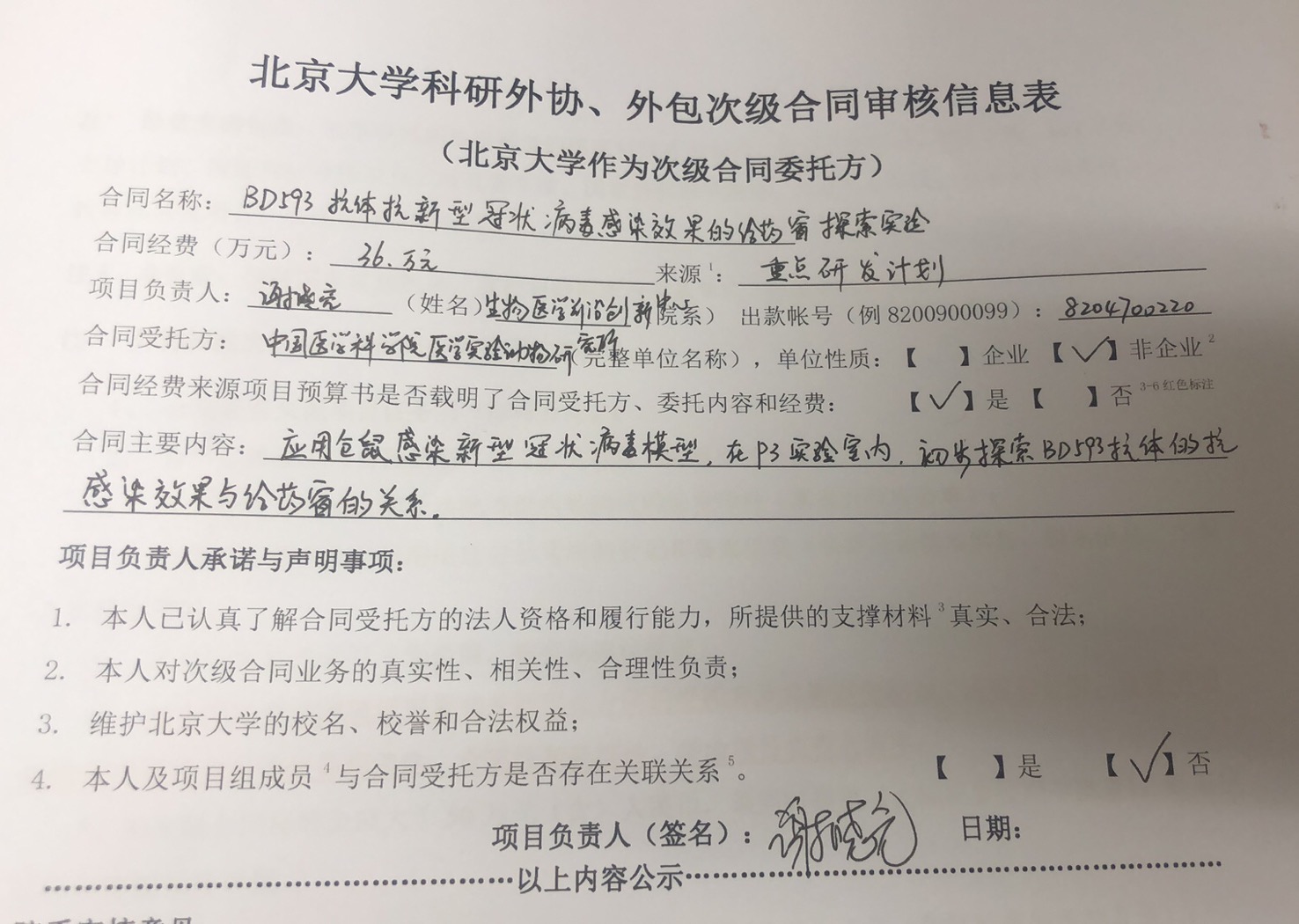 根据《关于北京大学理工科科研次级合同管理的通知》,现将北京大学理工科科研次级合同“BD593抗体抗新型冠状病毒感染效果的给药窗探索实验”相关内容予以公示。