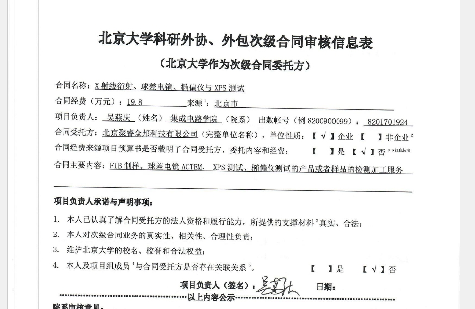 根据《关于北京大学理工科科研次级合同管理的通知》,现将北京大学理工科科研次级合同“X射线衍射、球差电镜、椭偏仪与XPS测试”相关内容予以公示。