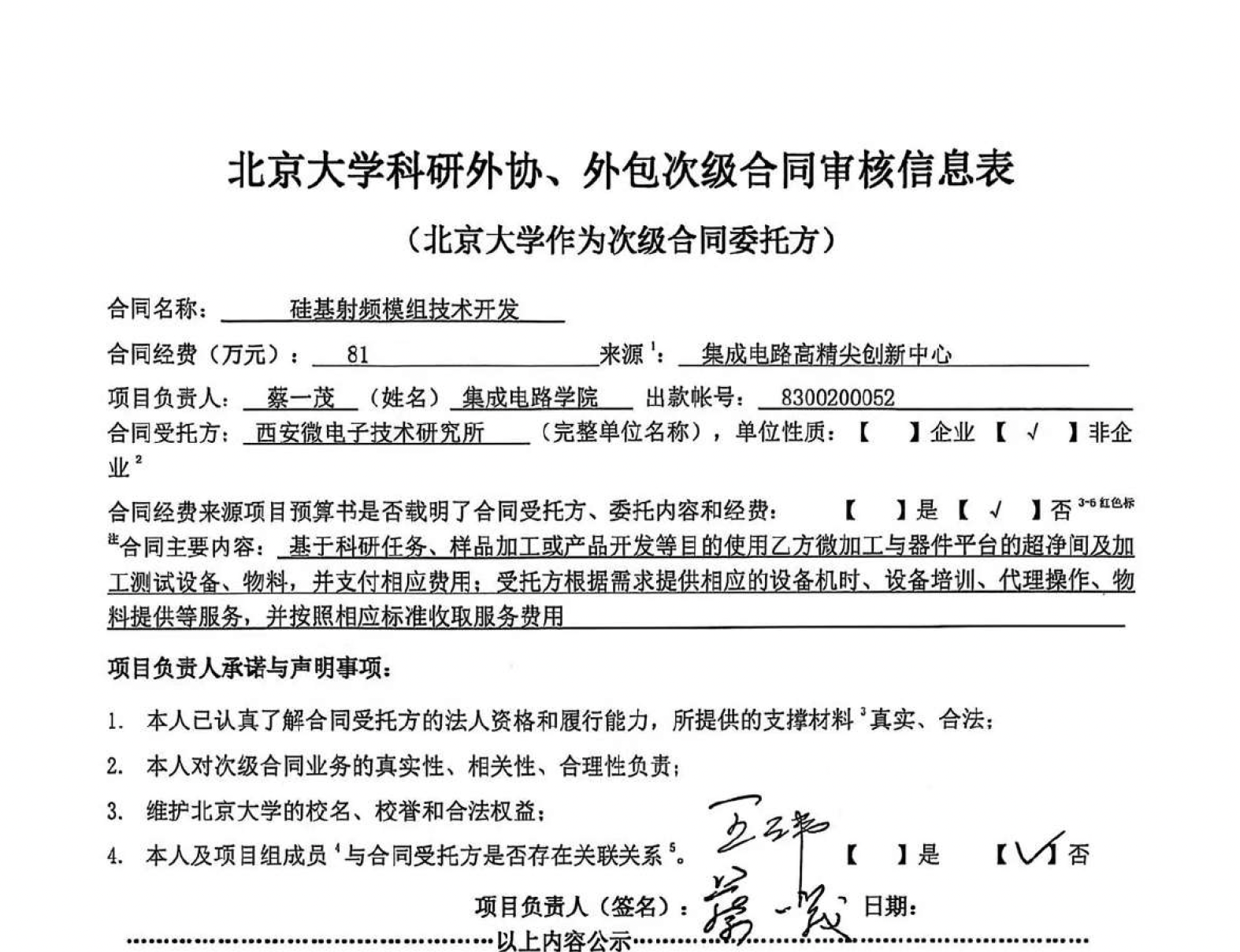 根据《关于北京大学理工科科研次级合同管理的通知》,现将北京大学理工科科研次级合同“硅基射频模组技术开发”相关内容予以公示。