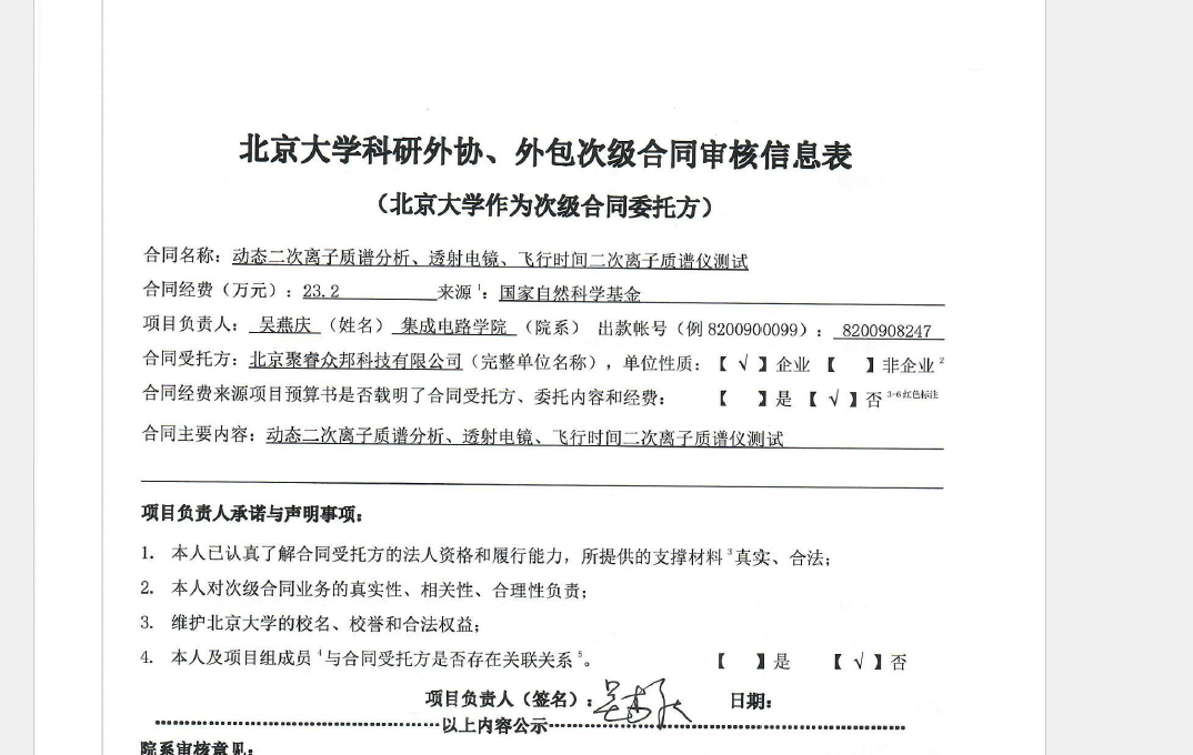 根据《关于北京大学理工科科研次级合同管理的通知》,现将北京大学理工科科研次级合同“动态二次离子质谱分析、透射电镜、飞行时间二次离子质谱仪测试”相关内容予以公示。 公示时间:2025年09月25日-2025年09月29日(3个工作日)。相关纸质材料可经预约后到燕园大厦1124办公室进行查阅。 如对公示内容有异议,可通过电子邮件(kyb@pku.edu.cn)或电话(010-62751448)进行反馈。