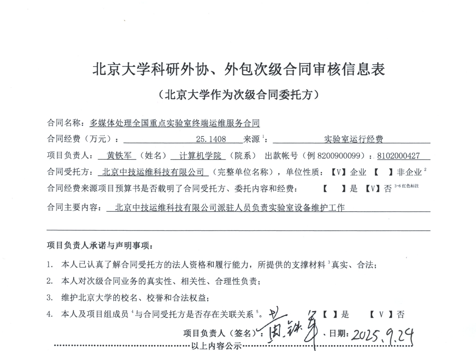 根据《关于北京大学理工科科研次级合同管理的通知》,现将北京大学理工科科研次级合同“多媒体处理全国重点实验室终端运维服务合同”相关内容予以公示。