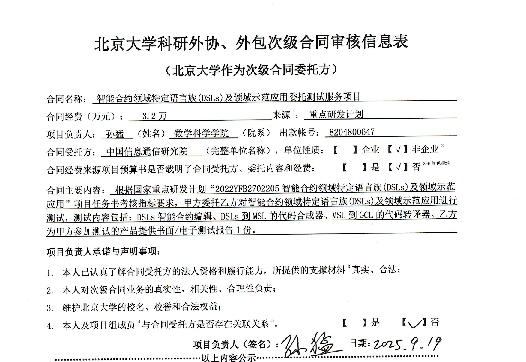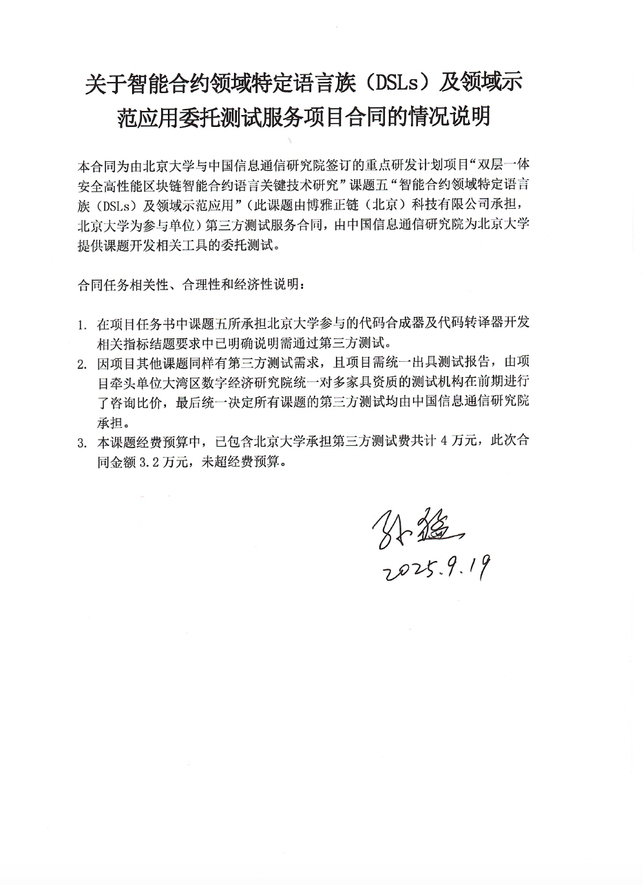 根据《关于北京大学理工科科研次级合同管理的通知》,现将北京大学理工科科研次级合同“智能合约领域特定语言族(DSLs)及领域示范应用委托测试服务项目”相关内容予以公示。
