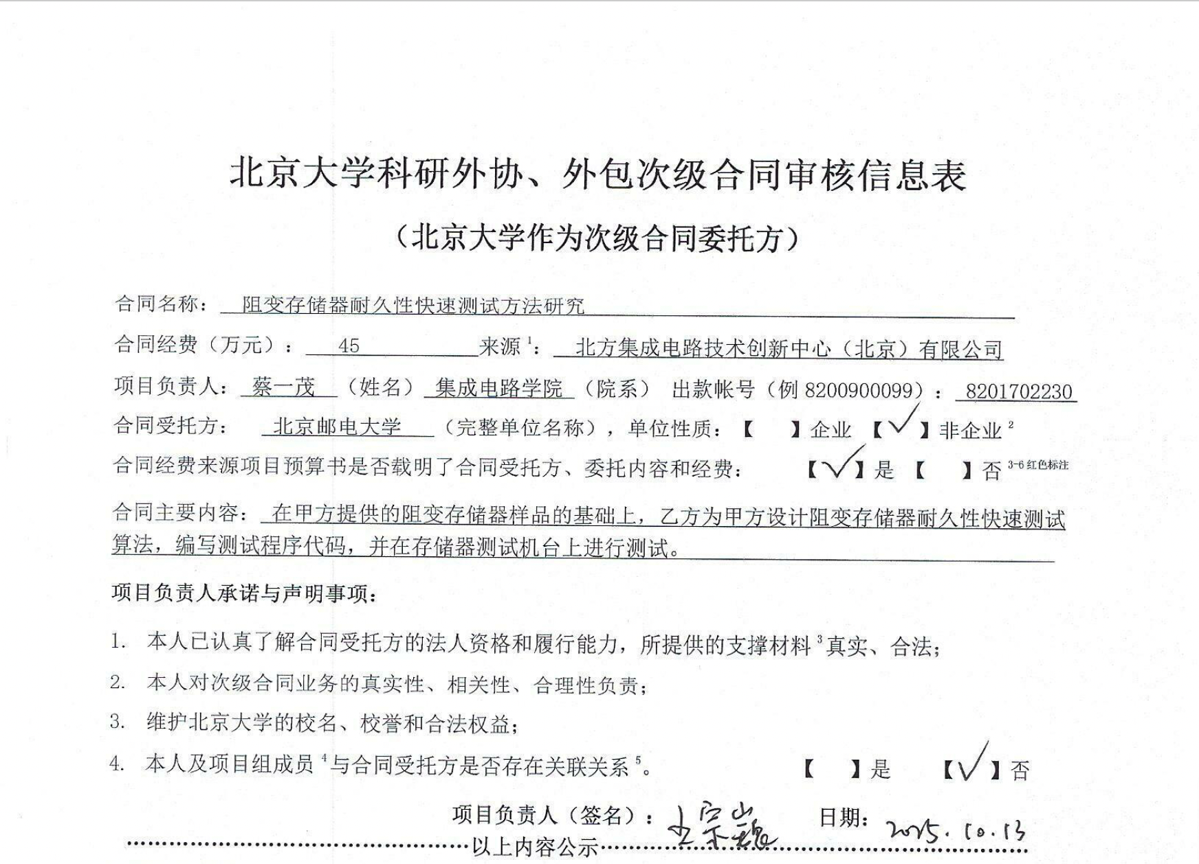 根据《关于北京大学理工科科研次级合同管理的通知》,现将北京大学理工科科研次级合同“阻变存储器耐久性快速测试方法研究”相关内容予以公示。