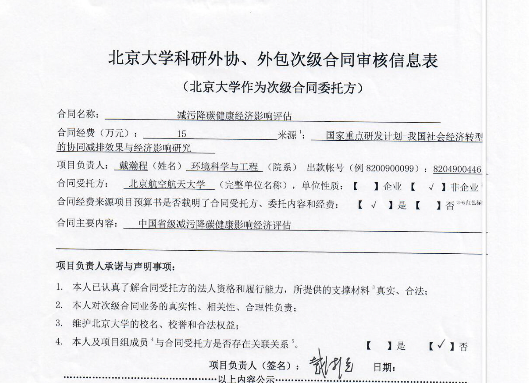 根据《关于北京大学理工科科研次级合同管理的通知》,现将北京大学理工科科研次级合同“减污降碳健康经济影响评估”相关内容予以公示。